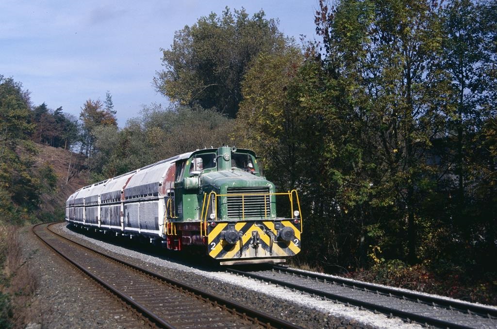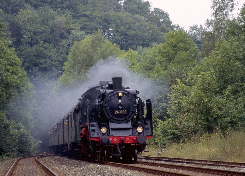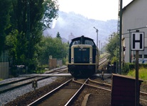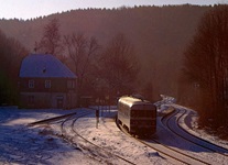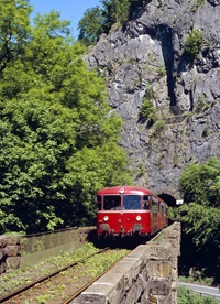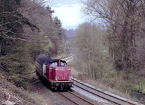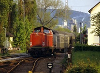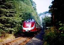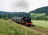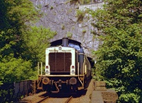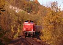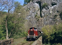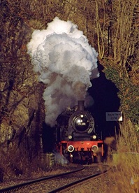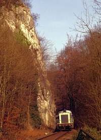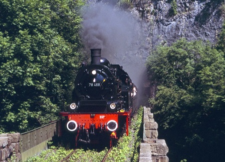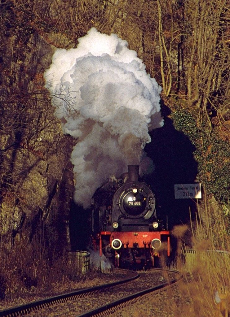Der Bereich zwischen dem ehemaligen Haltepunkt Oberrödinghausen und Binolen ist der reizvollste Teil der Hönnetalbahn. Hier ist vor allem der 117 m lange Uhu-Tunnel zu nennen. Hier sehen wir 78 468 am 15.06.2003, als sie den Tunnel mit einem Sonderzug verlässt.